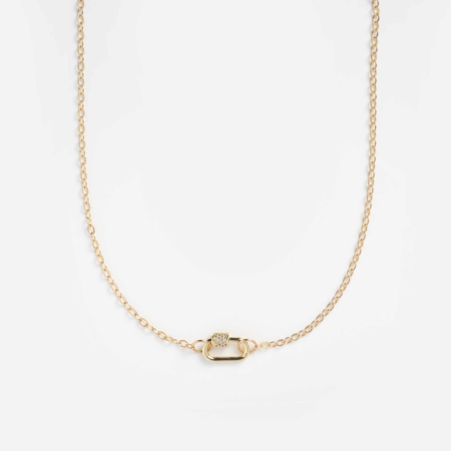 The Striped Chain Necklace with Carabiner features a sleek, textured chain paired with a bold carabiner clasp for a contemporary statement. Designed to elevate your everyday look, it delivers clean structure with just the right amount of attitude. Wear it solo for impact or customize it with charms for a layered, personalized style.