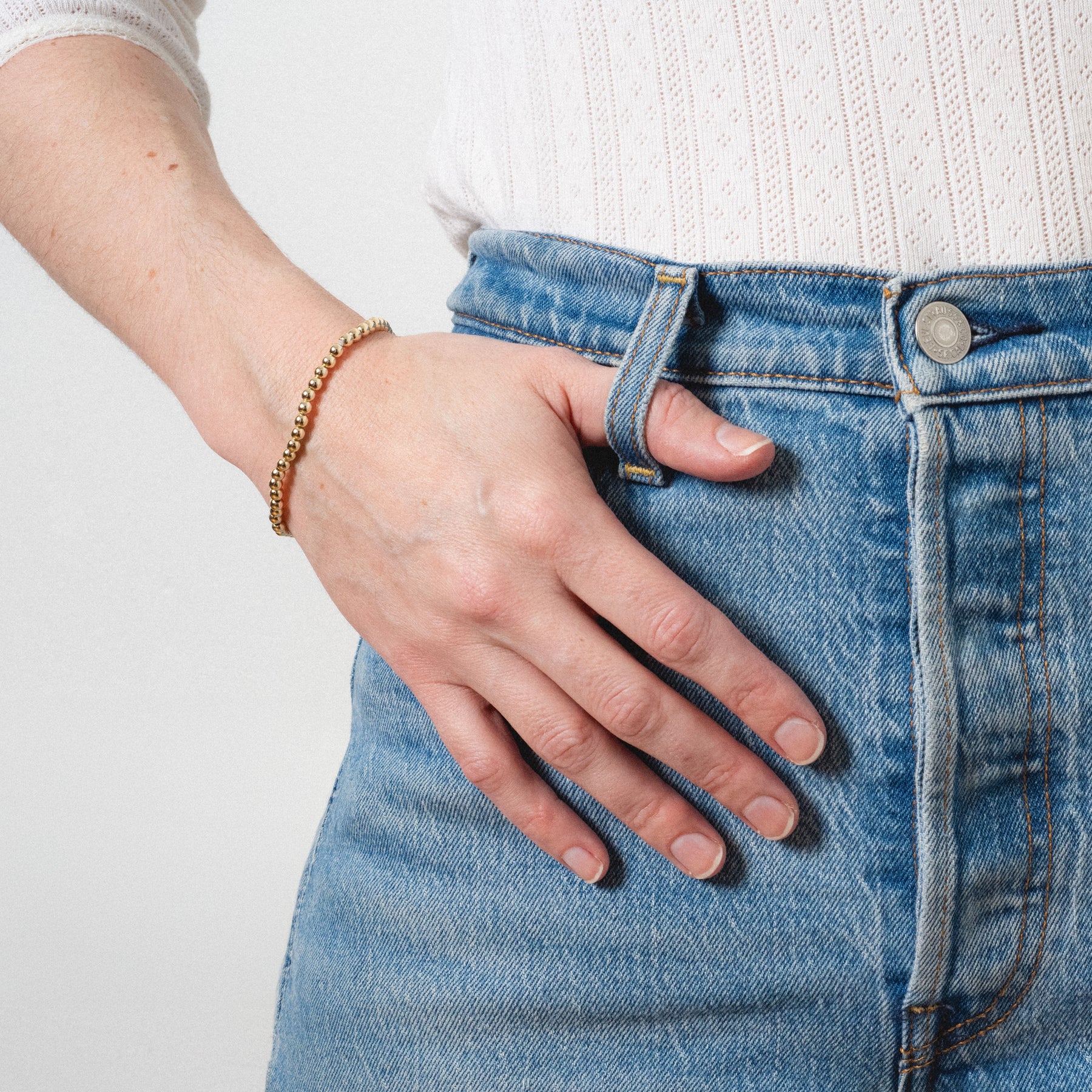 Gorgeous gold beads on a stretchy cord—slip it on and go! Perfect for everyday wear or stacking with other bracelets. Simple, cute, and effortlessly chic.