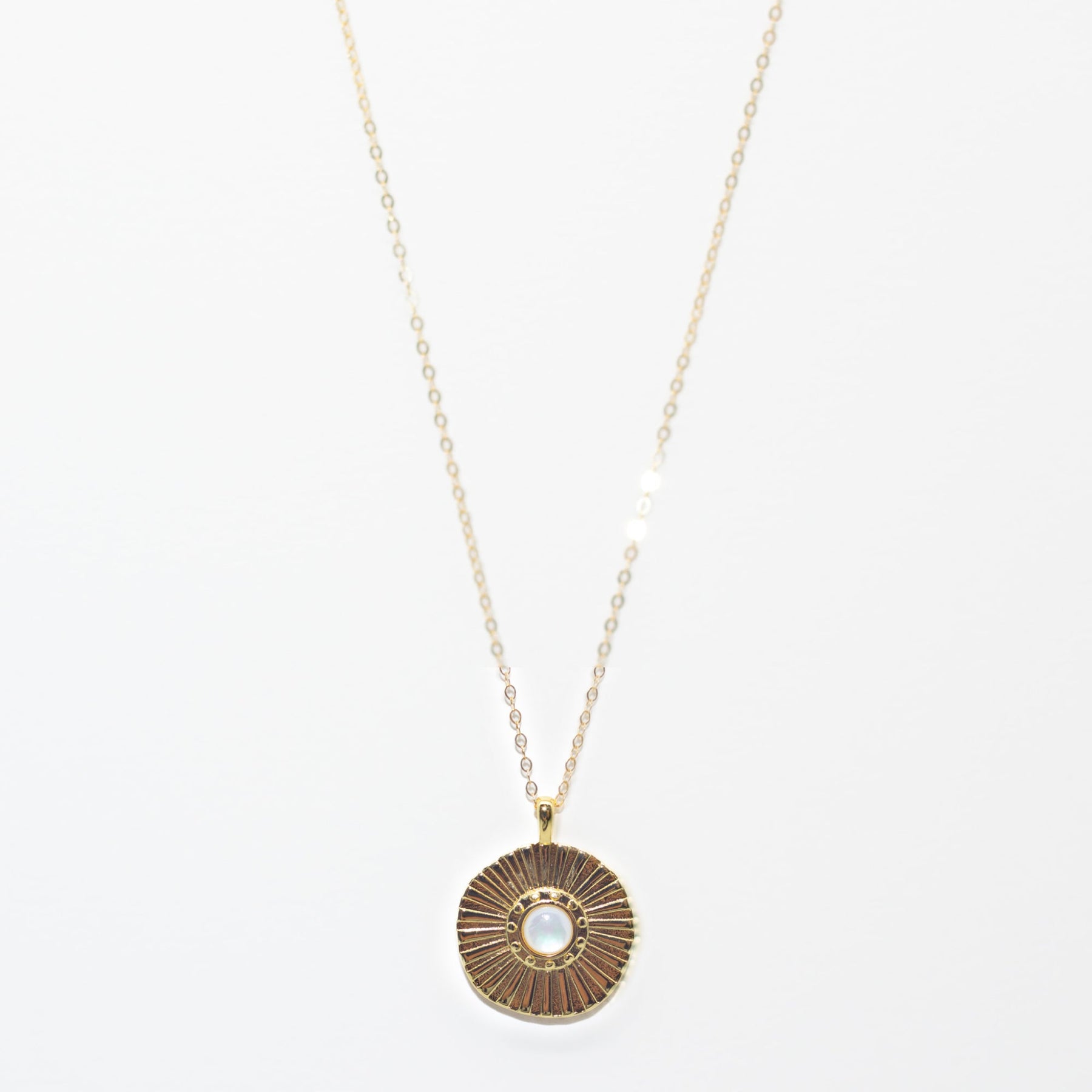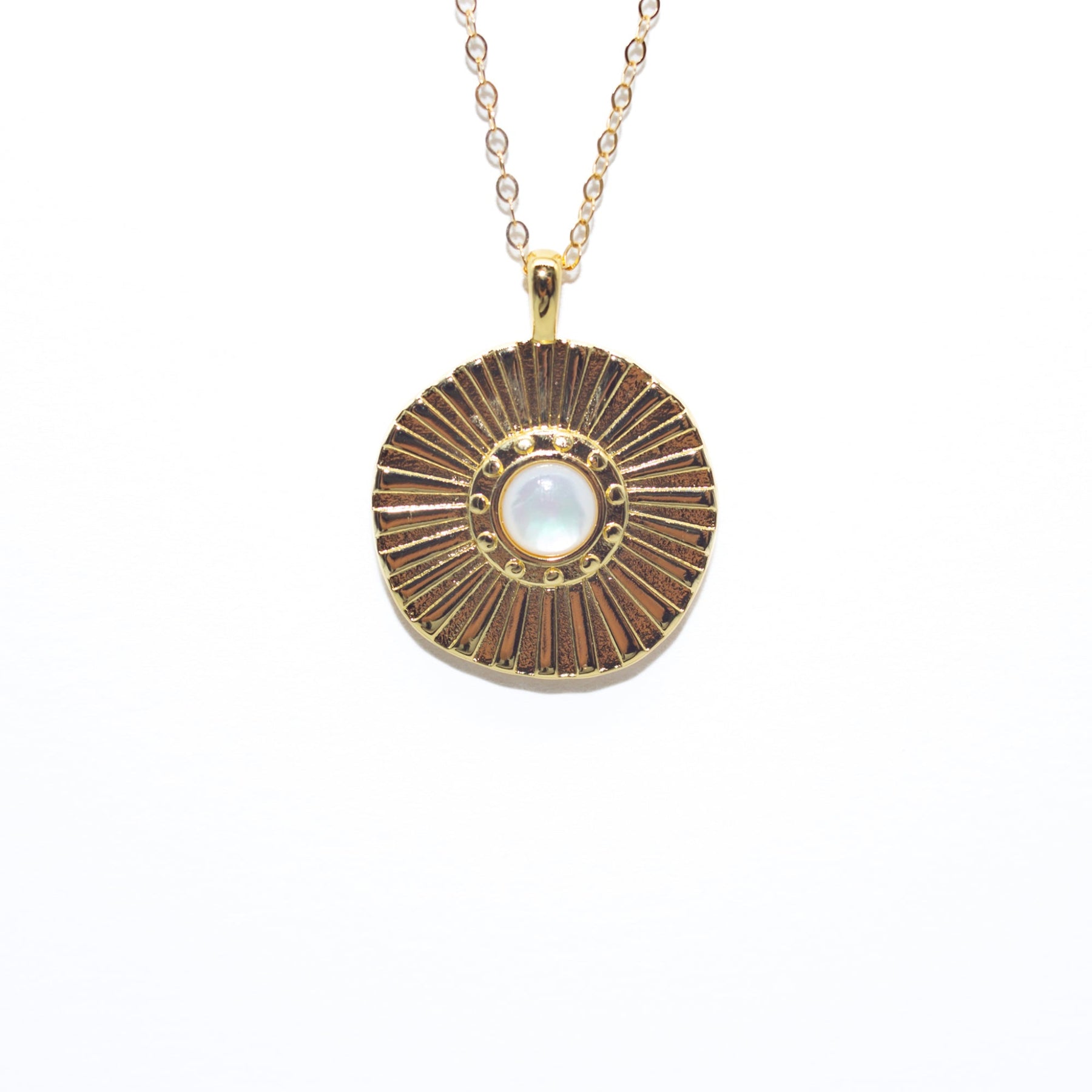Embrace the beauty of the night sky with our Moonbeam Necklace. The gold-filled pendant measures 27x22mm and features a center pearl surrounded by textured moonbeams. Its bold, standout design and long gold-filled chain (18 inches with a 2-in extender) make it an easy statement piece in any necklace stack.