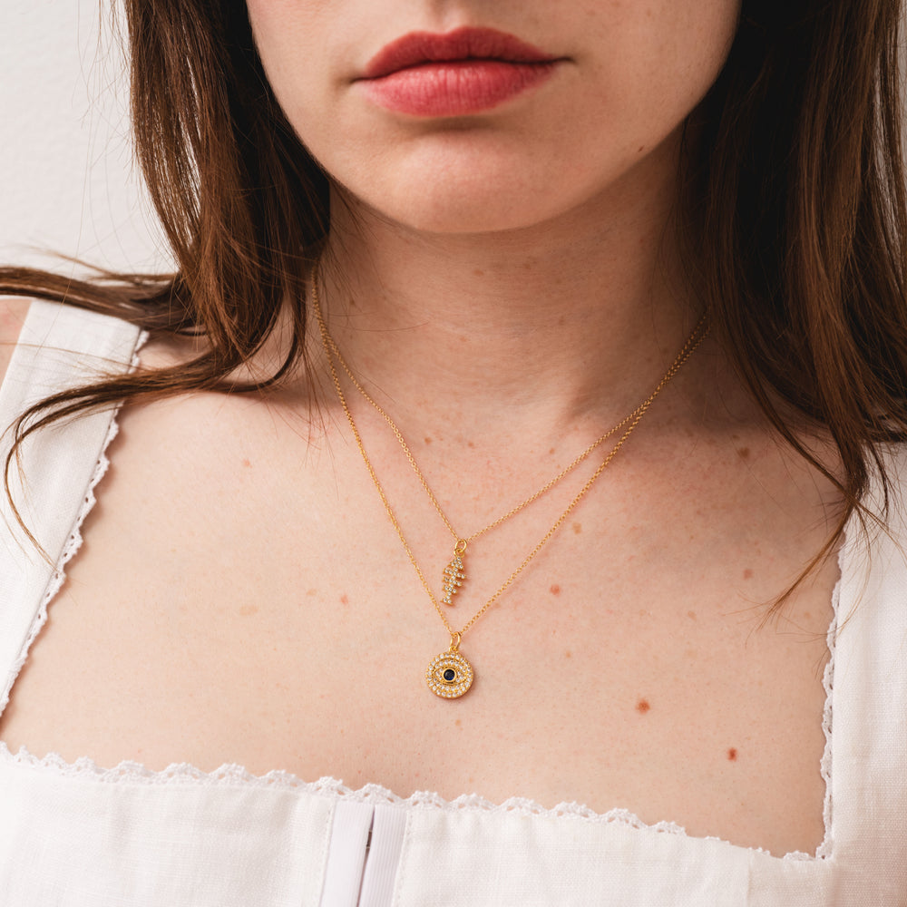 Good vibes only here, thanks to our Pave Evil Eye Necklace, designed to ward off negative energy and bad juju. The 12mm gold-filled and cubic zirconia pendant, complemented by a 16-inch gold-filled chain with a 2-inch extender, adds a touch of mysticism to your everyday ensemble.