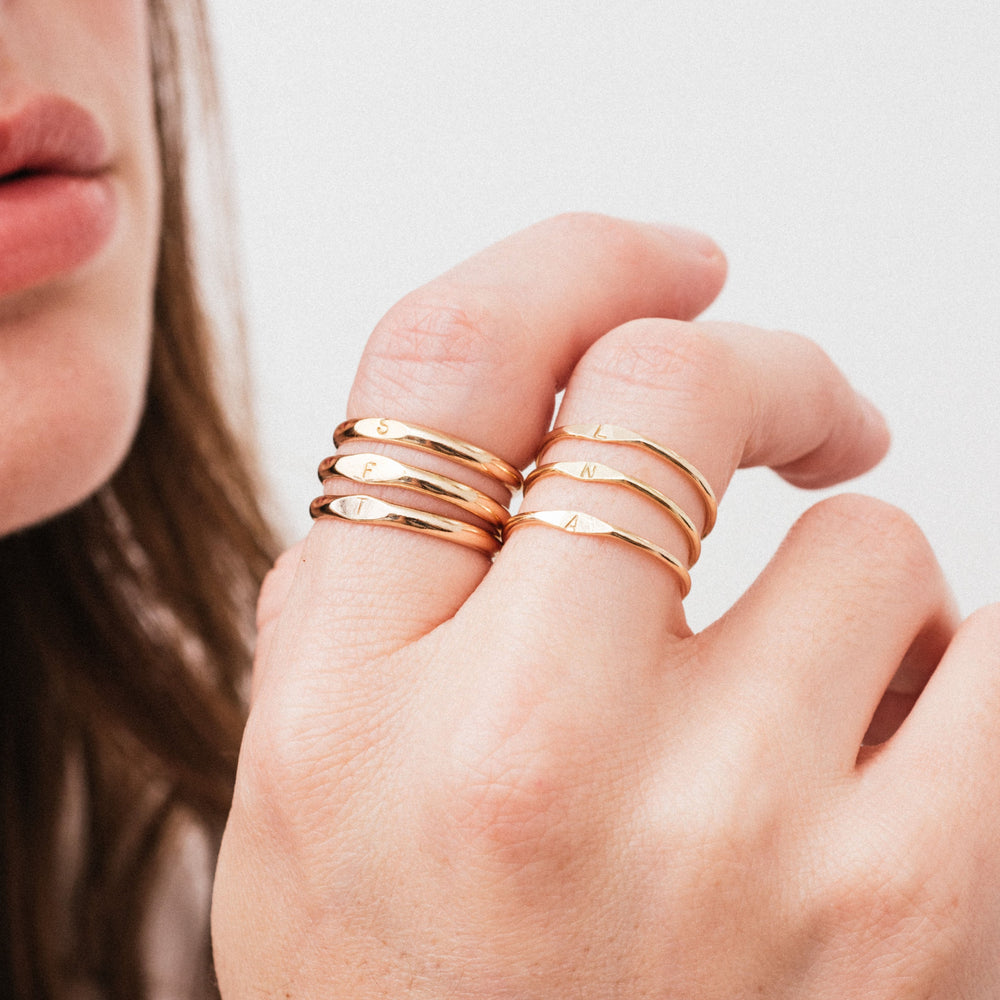 Completely personalized in a daintier version of our Thick Signet Ring, the Thin Signet Ring is the perfect way to honor yourself or someone you love. Each one is stamped with a special initial, making it a great way for mothers to honor children, grandmothers to honor grandchildren, or for you to honor other important people in your life. Available in gold fill or sterling silver and crafted by hand in our studio, each ring can be stacked with up to two other Thin Signet Rings, as well as our Thick Signet Ring for a one-of-a-kind combination that’s all your own.