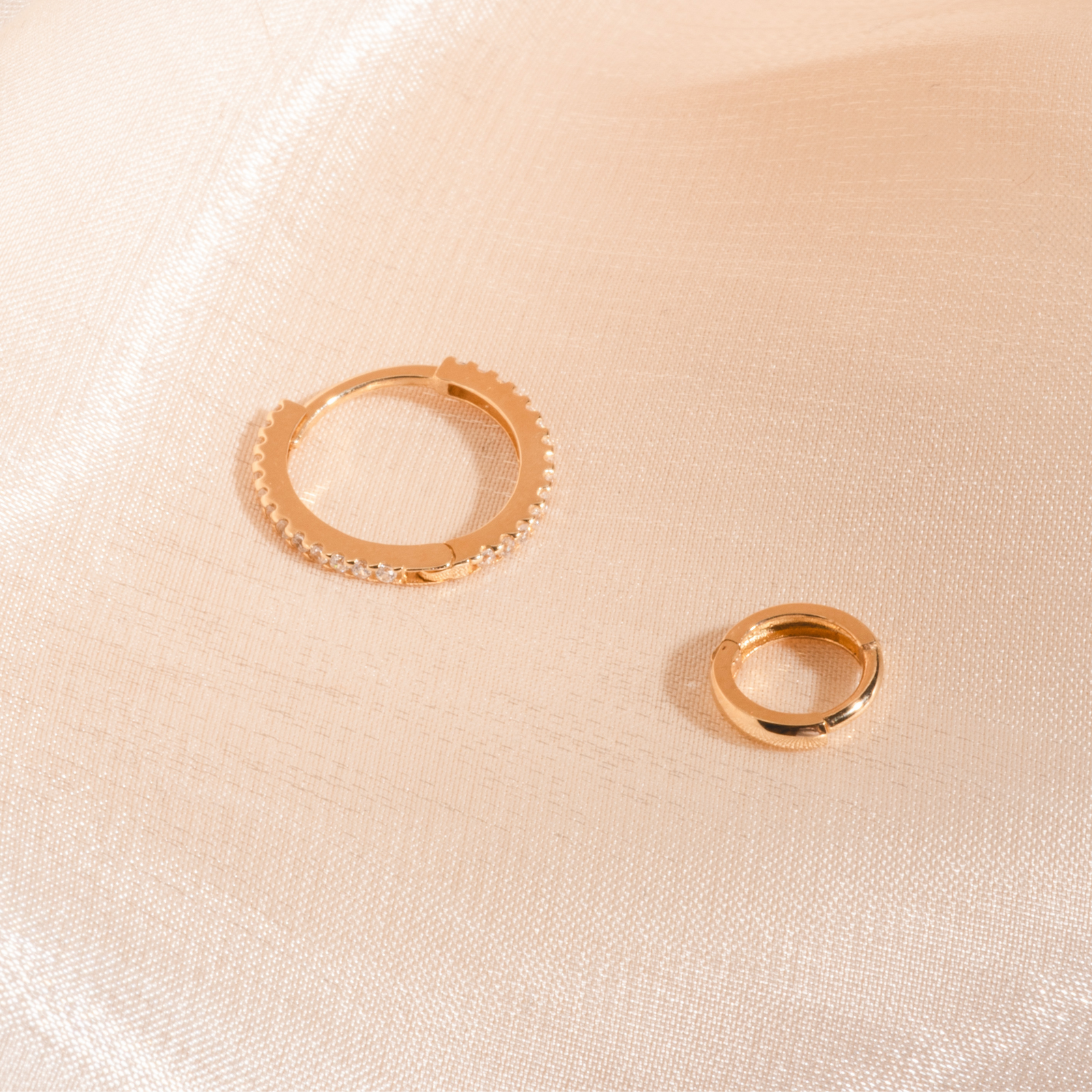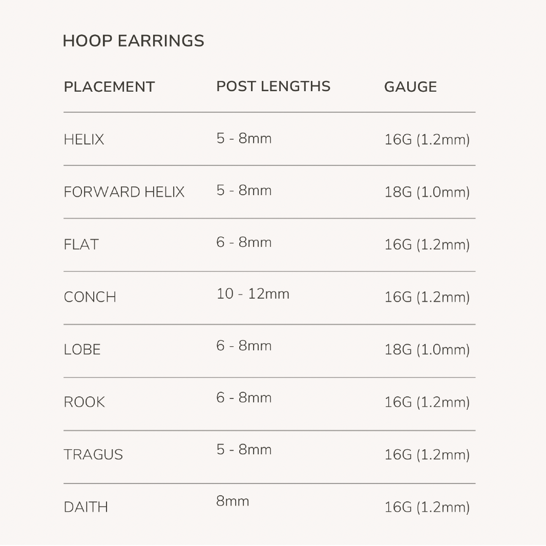 The diameter refers to the measurement between the inner edges of a hoop or ring. Smaller diameters correspond with smaller piercing areas, while larger diameters would suit areas like the Conch piercing, for example.