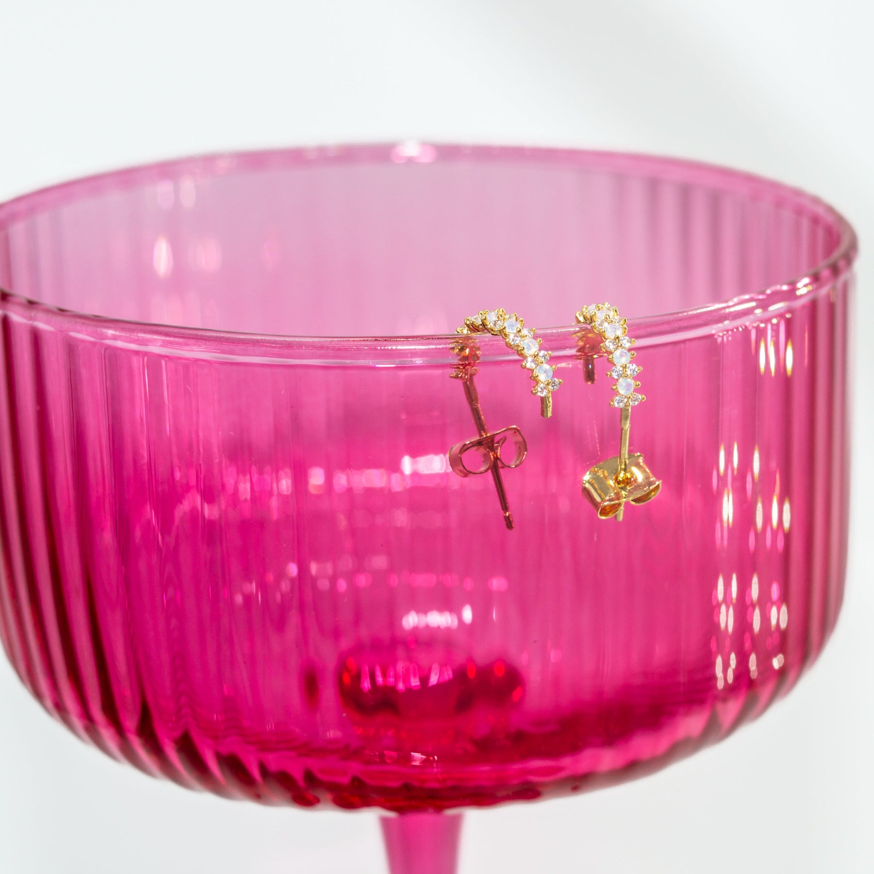 Gold hoop earrings with small stones on a white background
